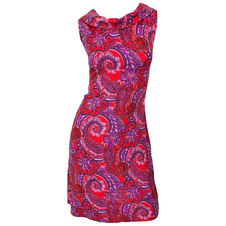 Chic 1960s Irish Linen Pink Red Purple Paisley Vintage 60s Mod Shift Dress For Sale At 1stdibs